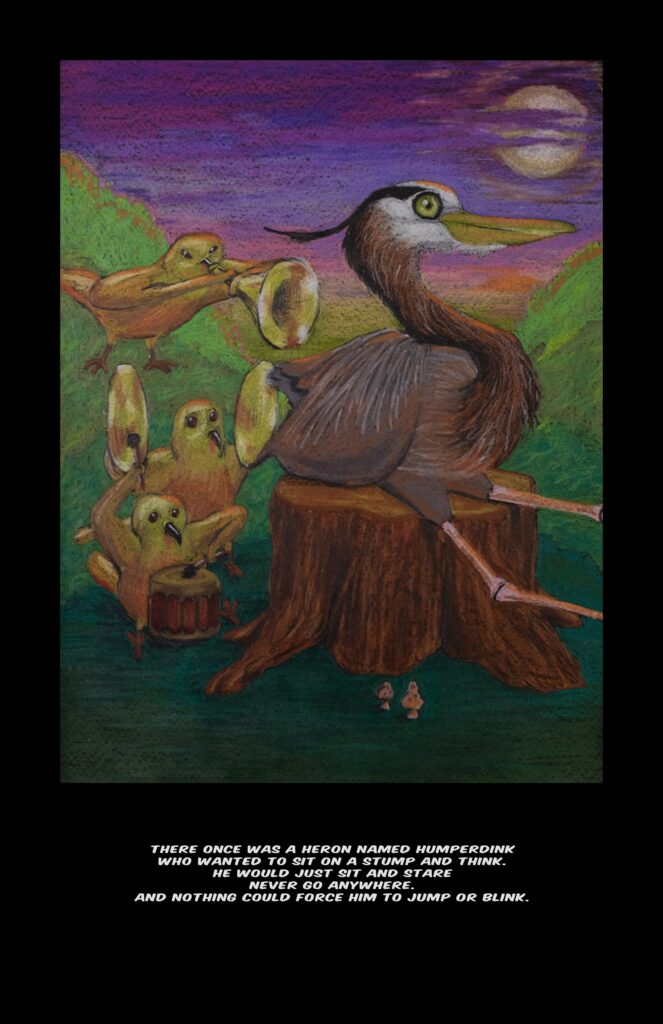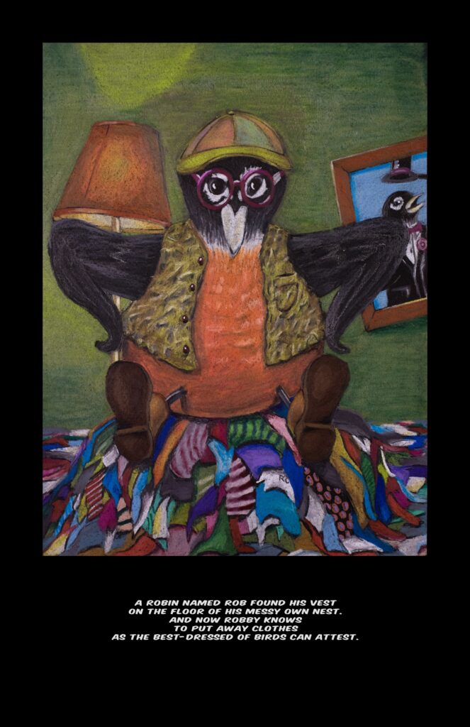 In the early 2000’s I wrote and illustrated a children’s book for my daughter. Each page was a different young bird that had a problem. After many rejections, I put the book away. I have brought it back as a collection of prints. The originals are colored pencils on black paper.